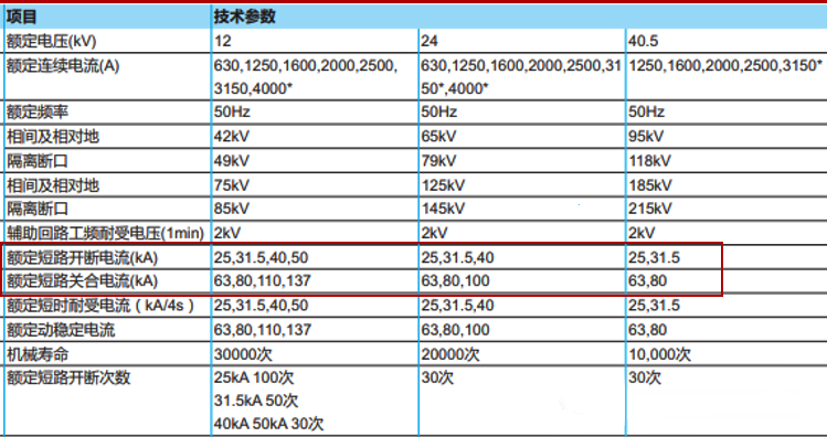 如下图所示,为某知名品牌的真空断路器部分技术参数,图中红色框内的额定短路关合电流与额定短路开断电流之比为2.5,该比值对12kV、24kV、40.5kV均有效。