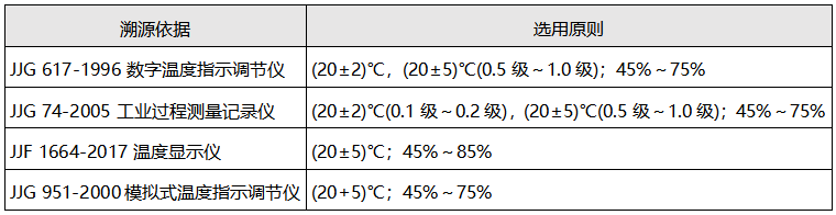 针对JJG 617-1996数字温度指示调节仪、JJG 74-2005工业过程测量记录仪、JJF 1664-2017温度显示仪、JJG 951-2000模拟式温度指示调节仪四个常用规程,以下从标准器具的选取、溯源的环境条件、溯源方法、示值误差计算等方面对常用温度二次仪表溯源进行对比。